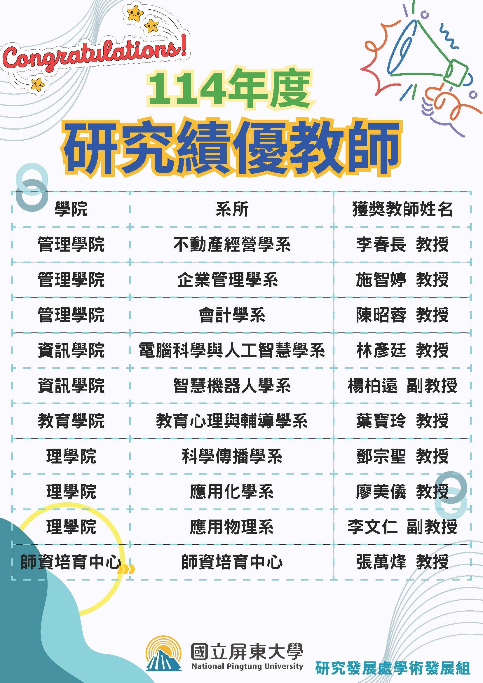 恭賀~本學院葉寶玲教授榮獲114年度研究績優教師!