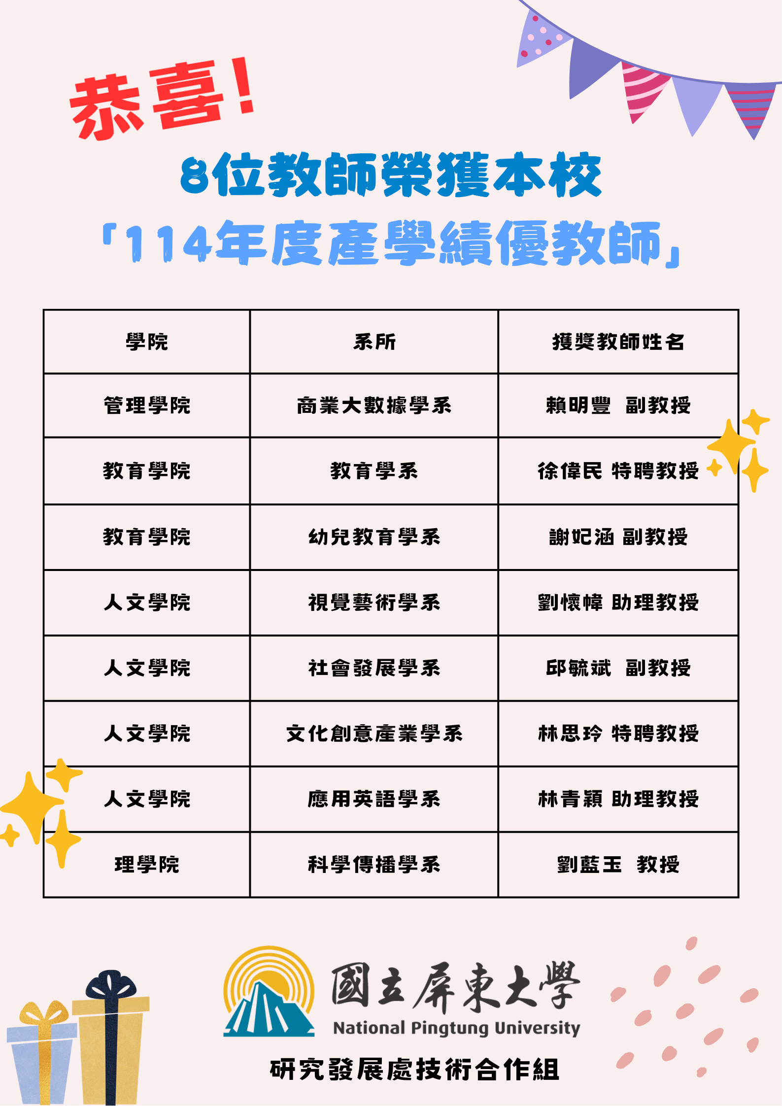 恭賀~本學院徐偉民教授、謝妃涵副教授榮獲114年度產學合作績優教師